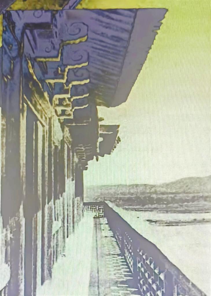 林競《西北叢編》一書載,其與蘭州友人于1919年2月7日出游雷壇河臥橋,“橋長十余丈,其形如弓,橋上蓋屋,足蔽風(fēng)雨,五彩繪畫,兩端有坊,東曰‘空中鰲背’,西曰‘天上慈航’,橋底無墩,自遠望之,宛如臥龍。”林競還詳細記錄了蘭州雷壇河臥橋的建造方法,并對之科學(xué)性表示肯定:“聞此橋原來有墩,因某年山洪爆發(fā),被其沖毀,自是始改今式。其法,先將兩岸之橋基筑好,以數(shù)丈長之巨木直列成排,復(fù)以橫木連之,木材之?dāng)?shù),依橋之寬狹而定,其前端伸出橋中約二三尺,其后端即以巨石壓之,如是疊架不已,每加一層,即前端伸過下層數(shù)尺,如倒掛之階梯然。而層與層之間,復(fù)聯(lián)以鐵環(huán)及釘木,迨兩岸相距不遠時,即以巨木渡之。此種構(gòu)造,在西北往往因河水湍急,不能筑墩,或游牧之民,不知在河中建筑橋墩之法而始用之。然亦甚合於力學(xué)原理,未可忽視也。”