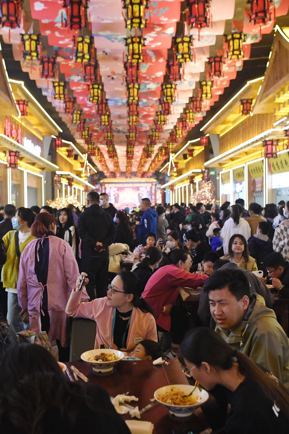 ↑3月25日,游客在“黃河食渡文化夜市”品嘗美食。