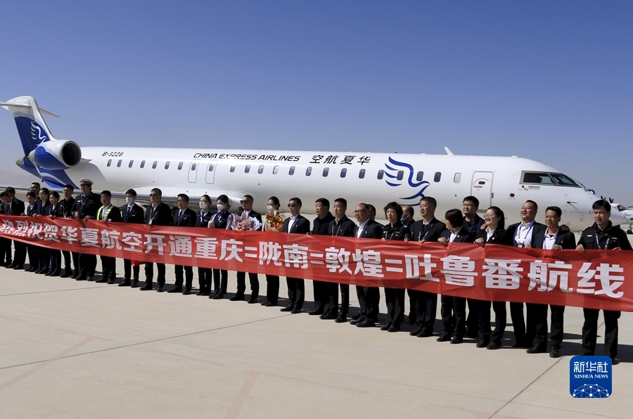 3月26日,由華夏航空執(zhí)飛的重慶-隴南-敦煌-吐魯番往返航線正式通航,這是首航航班機組人員與機場工作人員在甘肅敦煌莫高國際機場合影。新華社發(fā)(張曉亮攝)