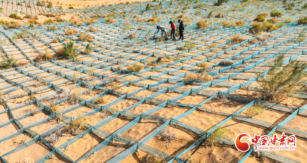 6月13日,張掖市高臺縣黑泉鎮(zhèn)北部荒漠區(qū)防沙治沙工程現(xiàn)場,林業(yè)技術人員正在壓沙方格內查看栽植梭梭的生長情況。