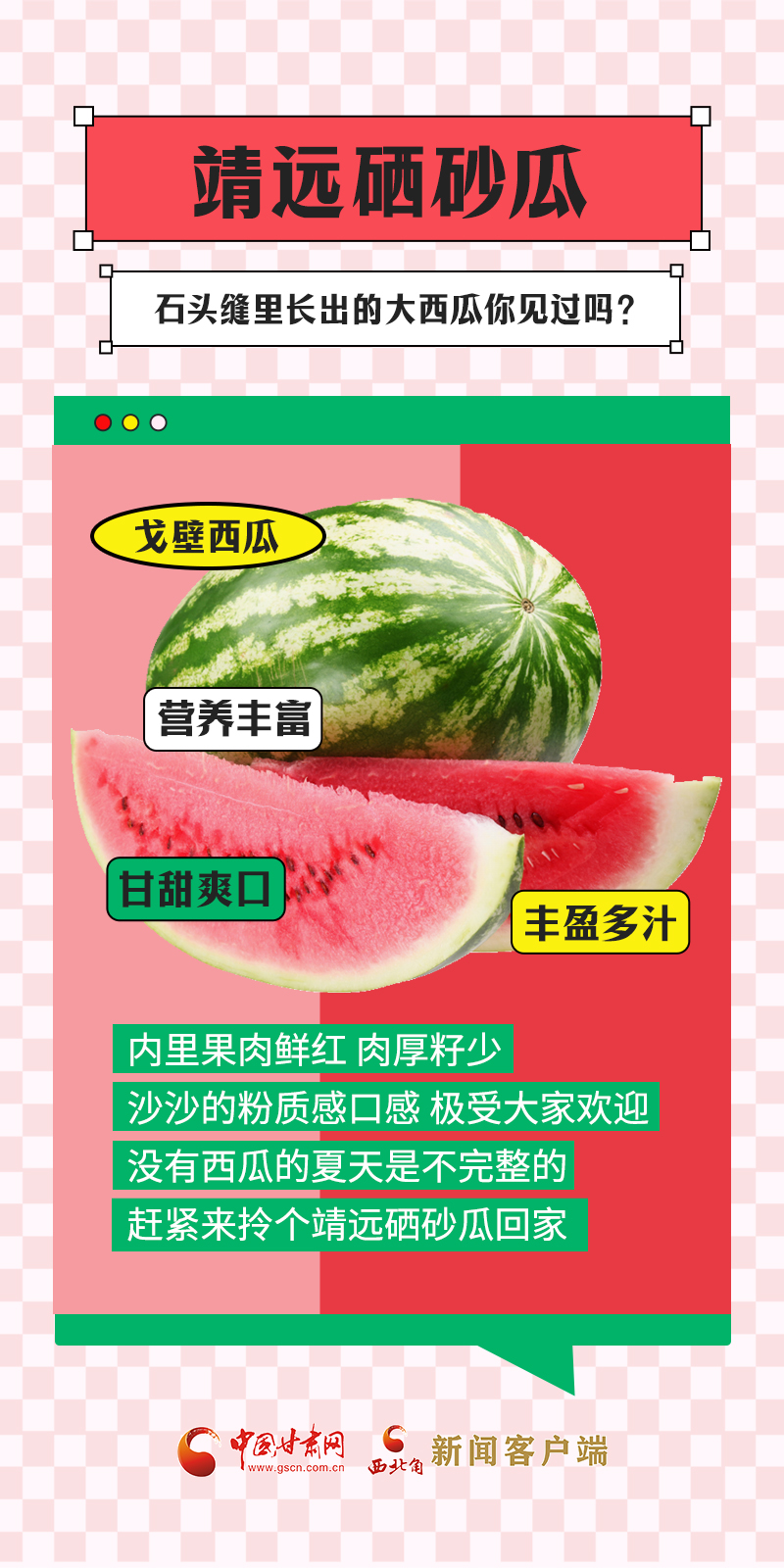 甘肅是中國自然地理多樣的省份,從隴南一直到敦煌,跨越了三大高原地帶、四大氣候類型,日照充足、干燥多風(fēng)、降水量少、晝夜溫差大,這種獨特的氣候特點,十分適宜水果的生長。盛夏時節(jié),甘肅各地時令瓜果陸續(xù)上市,不僅豐富了百姓的“果盤子”,也鼓起了農(nóng)民的“錢袋子”。“瓜果經(jīng)濟(jì)”在隴原大地上助力鄉(xiāng)村振興。