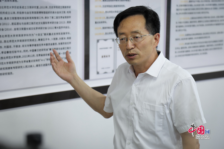 7月31日,西北師范大學(xué)歷史文化學(xué)院院長、博士生導(dǎo)師劉再聰向“簡牘中國”媒體團(tuán)介紹簡牘學(xué)學(xué)科建設(shè)情況。中國網(wǎng)記者 鄭偉 攝