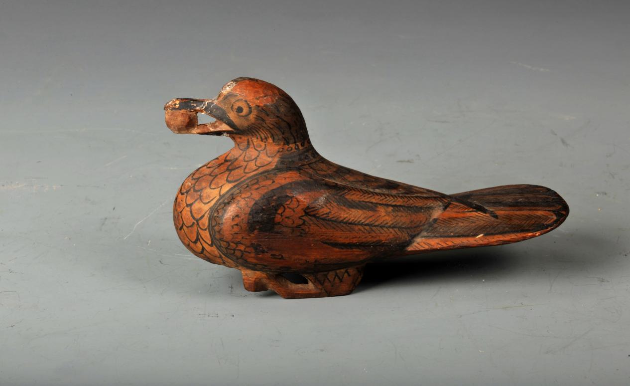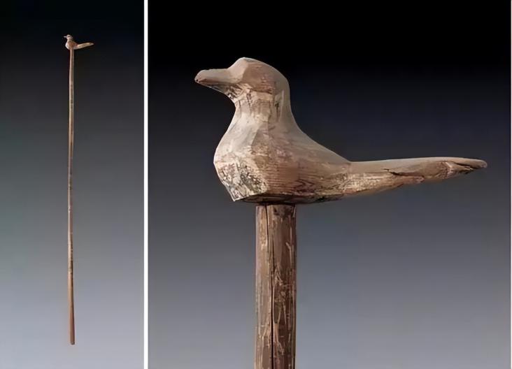 木鳩是王杖的杖首。在武威市博物館里,就有一件國寶級(jí)文物漢代彩繪漆木鳩:一只臥姿木質(zhì)鳩鳥,雙目平視,口中含物,兩翼收攏于背部,尾呈平行片狀,兩足曲伸,中有方形卯,為杖桿接榫處。通體墨彩繪制,從頸至腹繪魚鱗狀羽毛,兩翼及尾上部繪魚骨狀羽毛?!逗鬂h書·禮儀志》中記載:“王杖長九尺,端以鳩鳥為飾。鳩者,不噎之鳥也。欲老人不噎。”,“鳩”同于漢字“九”,有九九長壽的寓意;鳩鳥被稱為不噎之鳥,表達(dá)了對(duì)老人吃飯不噎、身體康健的美好祝愿。
