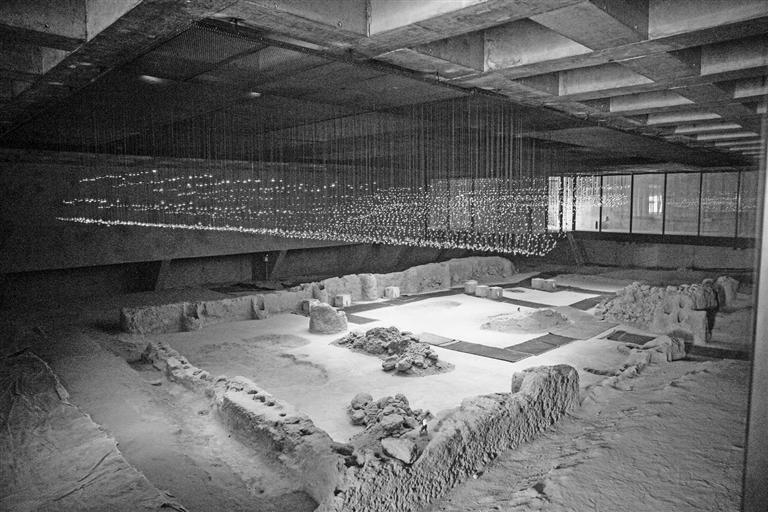 在遺址的半山中心位置有一座微微隆起的現(xiàn)代建筑,下面是被保護的大型宮殿式建筑——F901,該建筑屬于第四期文化,即仰韶晚期,約距今5000年,是目前所見我國新石器時代面積最大、工藝水平最高的房屋建筑。F901以長方形主室為中心,主室面積131平方米,東西中軸線長16米、南北中軸線寬8米。兩側擴展為與主室相通的東西側室,左右對稱;主室后面設單獨的后室,前面有附屬建筑,前后呼應、主次分明,形成一個結構復雜、布局嚴謹、占地總面積達420多平方米的建筑群體。其居住面大部分保存完好,以輕骨料、砂石、料姜石粉混凝而成的類似現(xiàn)代水泥地面,光潔而堅硬,它是大地灣乃至清水河沿岸的原始部落的公共活動中心——一座宏偉而莊嚴的部落會堂。
