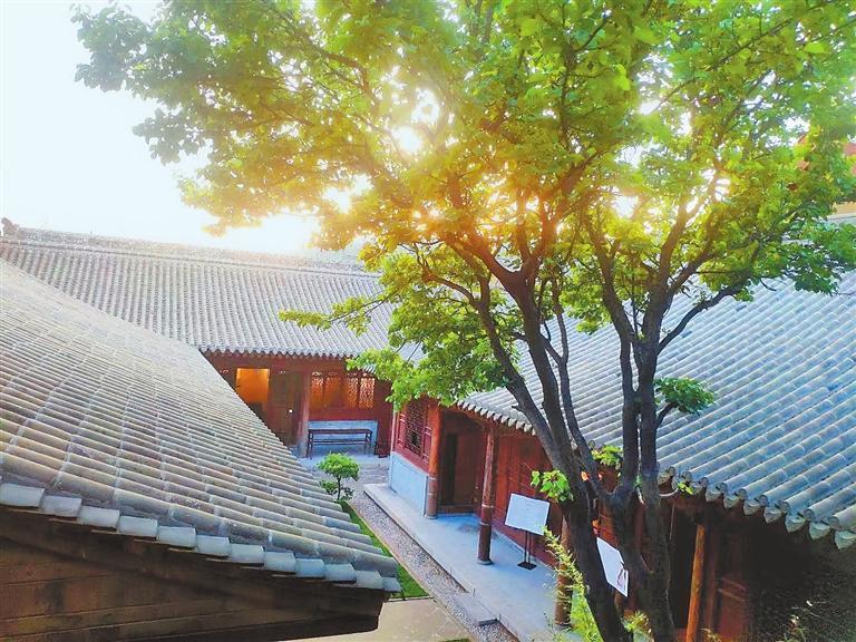 從大殿向后走就是太極殿,沙孟海先生的榜書與周圍古柏一樣雄渾蒼勁。殿門兩側,有團龍、團鳳雕窗,經過數(shù)百年的時光流逝,仍栩栩如生。
