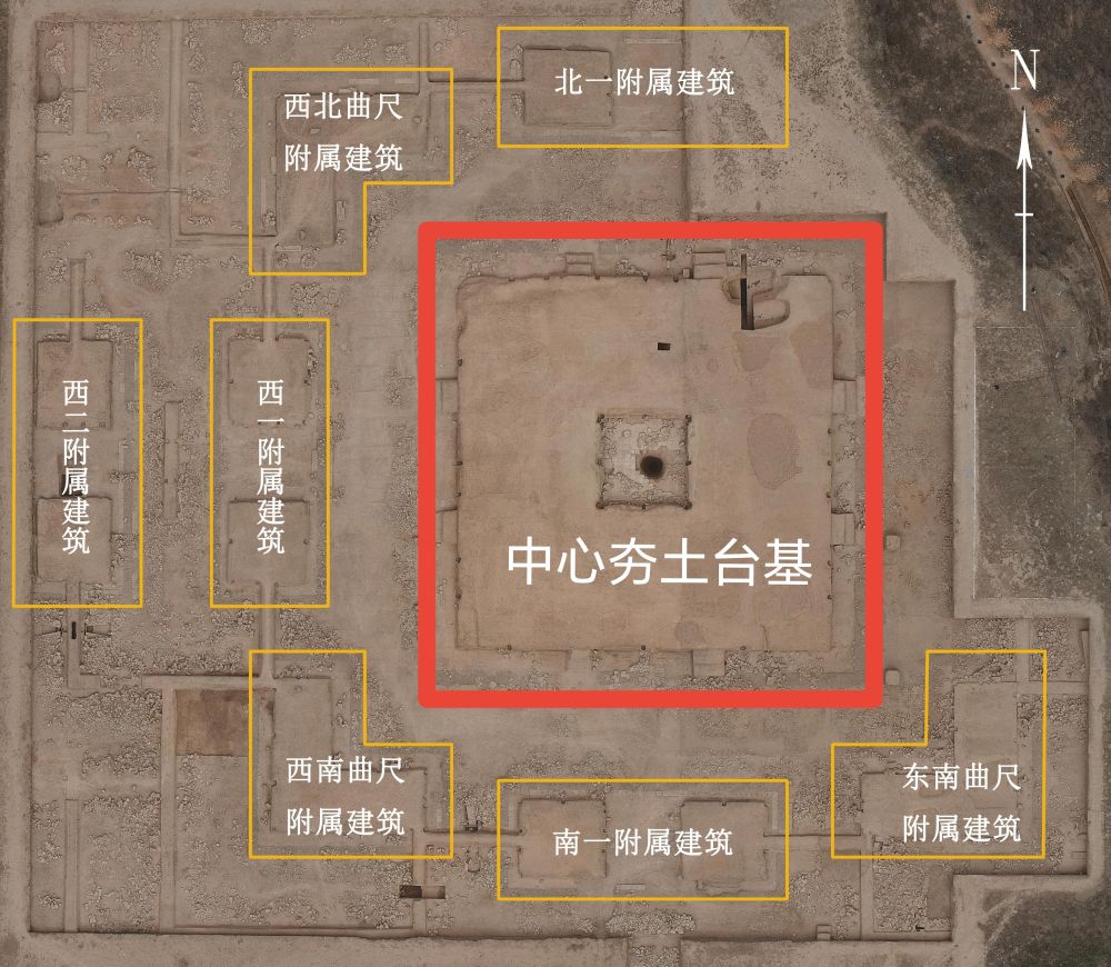 遺址結(jié)構(gòu)清晰——以中心夯土臺(tái)基為中心,東西南北各有兩組并行對(duì)稱的長(zhǎng)方形附屬建筑,四角分布曲尺形附屬建筑。殘留建筑遺跡面積近9000平方米。