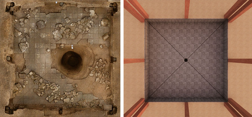 這是四角坪遺址中央夯土臺(tái)基中心的半地穴空間及甘肅考古工作者繪制的復(fù)原圖。