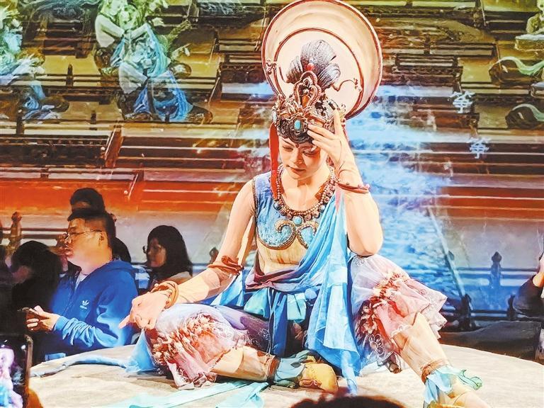 “真是一場酣暢淋漓的敦煌樂舞盛宴。雖然這趟旅程我們還沒有去敦煌莫高窟,但看罷這場演出,已經(jīng)對莫高窟壁畫有了初步的認知。莫高窟壁畫的精華部分,借助高科技手段和演員的精彩演繹,在我們眼前立體延展開來,同時劇場內(nèi)大量復(fù)刻了佛龕、蓮花臺、藻井等特色形制,讓我們‘一眼入境’,帶我們走進歷史深處,觸摸文明脈動。”浙江游客王松攜家人觀看《樂動敦煌》后,發(fā)出贊嘆。