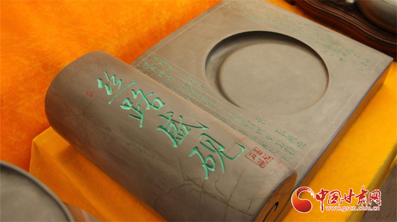 嘉峪石硯,取材于嘉峪山后的黑山峽深處,故又稱“黑山石硯”,是目前所知最早的古石硯之一。這種石硯質(zhì)堅(jiān)而細(xì)、扣之有聲,發(fā)墨快而不損毫,儲(chǔ)墨久而不干,“有史記載的三百多種石硯中,只有嘉峪石硯是帶有銘文出土的。這對(duì)于石硯的研究具有重要的史料價(jià)值。”劉宗學(xué)向?qū)嵺`團(tuán)成員系統(tǒng)地講述了嘉峪石硯的傳承歷史,并展示了自己以絲綢之路為主題創(chuàng)作的“絲路盛硯”組合石硯。這套石硯主要以甘肅十四個(gè)地州市的建筑、景觀、歷史人物為內(nèi)容,體現(xiàn)了甘肅省的根脈文化、黃河文化、長城文化、絲路文化、紅色文化等五大文化,表現(xiàn)出甘肅在絲綢之路經(jīng)濟(jì)發(fā)展與文化交流中的重要作用。