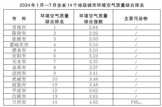 2024年1月—7月,全省14個(gè)地級(jí)城市環(huán)境空氣質(zhì)量綜合排名由高到低分別為:甘南州、隴南市、張掖市、嘉峪關(guān)市、酒泉市、慶陽市、天水市、金昌市、定西市、武威市、臨夏州、平?jīng)鍪?、白銀市、蘭州市。