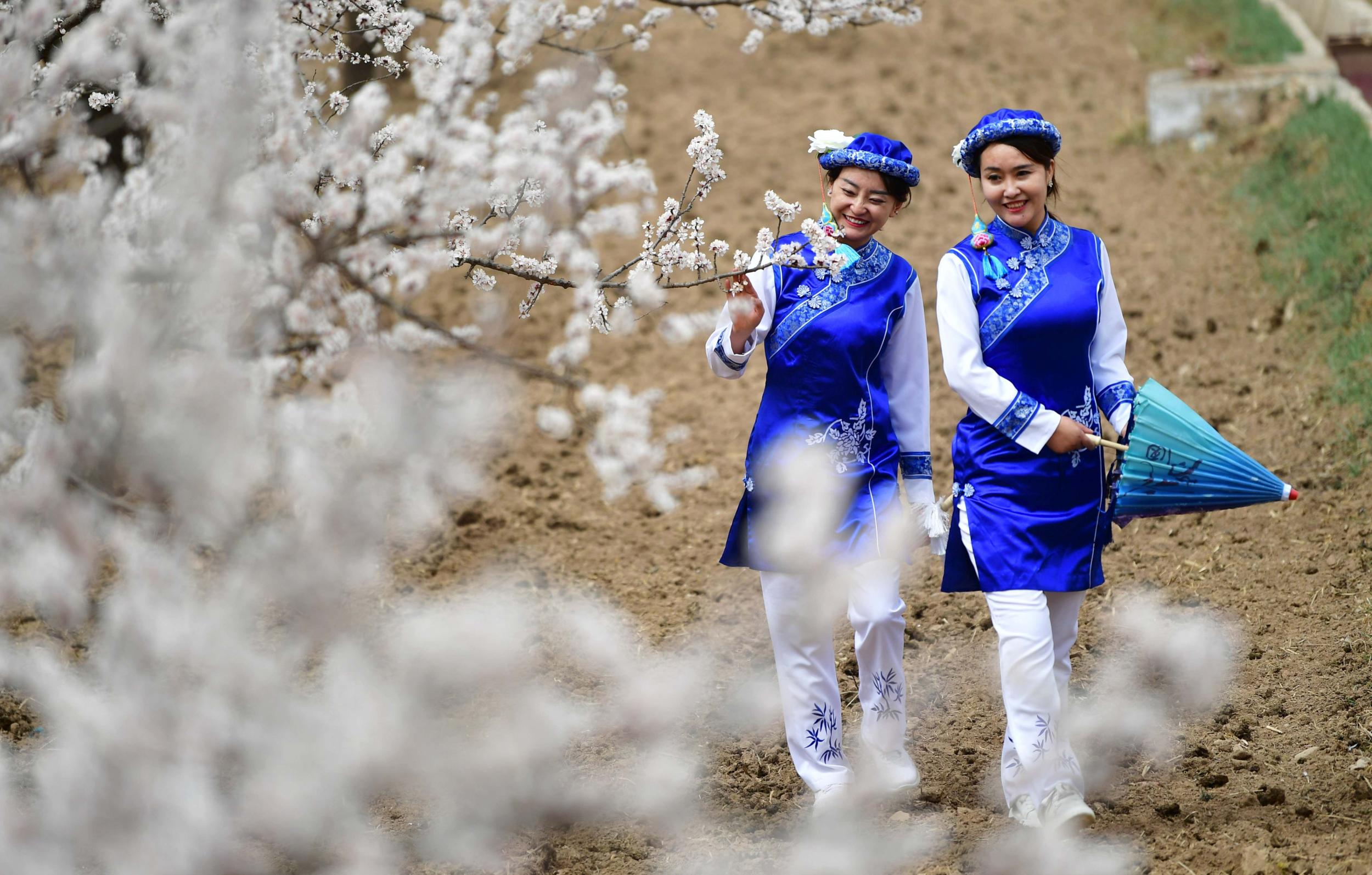 素有“隴上杏花第一村”美譽(yù)的甘肅省臨夏回族自治州東鄉(xiāng)族自治縣唐汪鎮(zhèn)杏花競(jìng)相綻放,吸引了眾多當(dāng)?shù)厝罕姾陀慰吞で噘p花。新華社記者陳斌攝