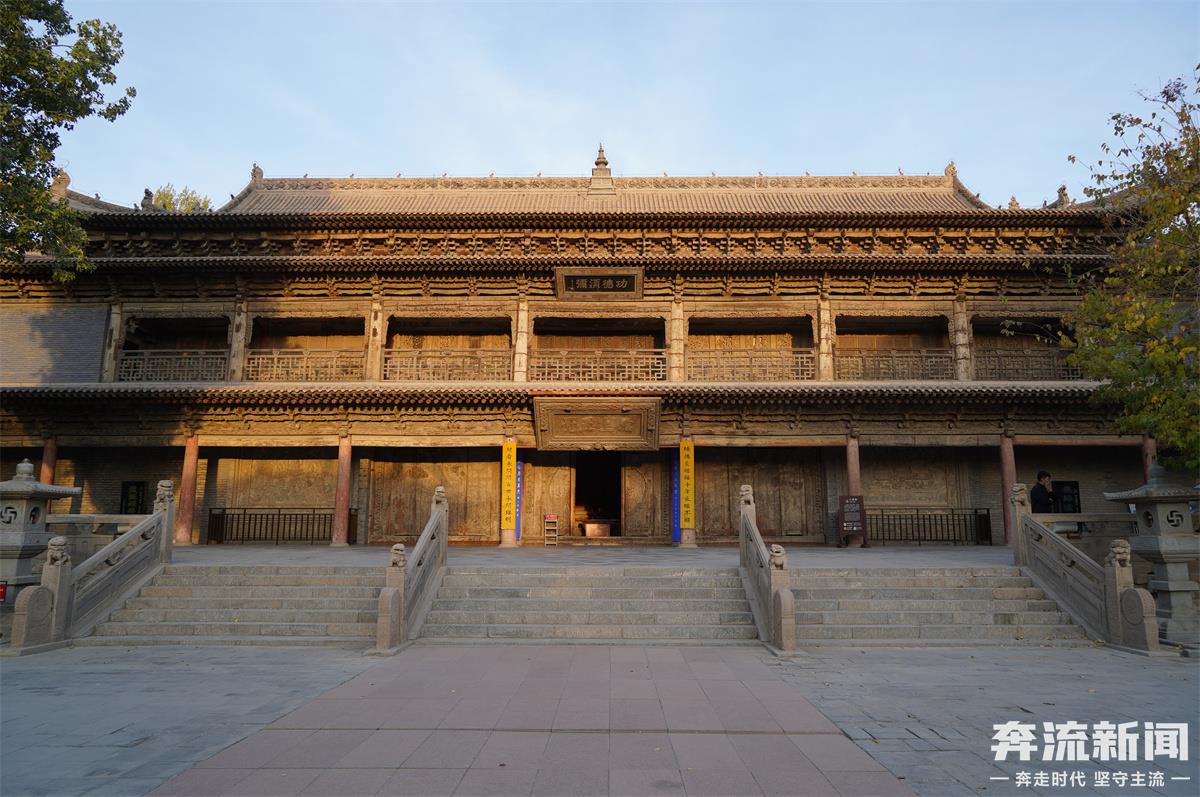 大佛殿正中,臥佛安然酣睡,佛身長35米,肩寬7.5米。造像木胎泥塑,金妝彩繪,頭枕蓮臺,面西而臥。雙眼半閉,嘴唇微啟,姿態(tài)安詳。臥佛首足處塑大梵天、帝釋天立像,身后為十大弟子舉哀像,南北兩側(cè)塑十八羅漢群像,造型精美,栩栩如生。殿身兩層樓閣,青瓦飛檐、朱柱環(huán)立,殿門兩側(cè)有佛經(jīng)變故事磚雕,四周墻面及上層板壁繪明清時期諸天禮佛、山海經(jīng)故事、西游記故事及佛經(jīng)變故事壁畫,面積約530平方米。