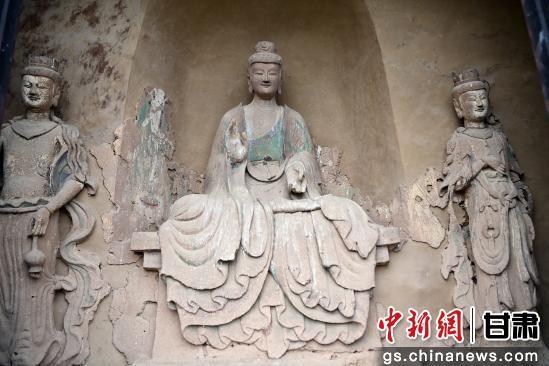 2024年6月4日,甘肅天水,麥積山石窟第44窟的西魏泥塑一佛二菩薩組像。主尊佛像被譽為“東方美人”。(資料圖)九美旦增 攝