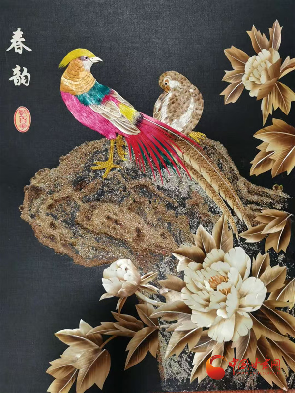 多年打磨后,郭百花走出了獨(dú)特的創(chuàng)作之路——以拼貼手法為主,讓作品更具層次感與立體感。在她十幾平米的“百花麥稈藝術(shù)工作室”里,《春韻》勾勒出江南詩意,《敦煌文旅》再現(xiàn)絲路風(fēng)情,《孔雀戲牡丹》盡顯雍容華貴,而《錦上添花》中,小鳥的羽毛竟由細(xì)如發(fā)絲的麥稈剪貼而成,市場(chǎng)價(jià)達(dá)1500元左右。這些作品里,既有山川花鳥的靈動(dòng),更藏著通渭的鄉(xiāng)土記憶,平凡麥稈在她手中徹底“化腐朽為神奇”。
