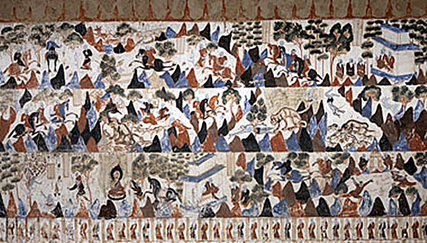 作為莫高窟北周壁畫的代表作,第428窟《薩埵太子本生》突破了傳統(tǒng)單幅畫面的局限,以三層長卷分欄鋪陳。畫師巧妙運用群山作為情節(jié)分隔,既保持畫面獨立性,又通過蜿蜒的“S”形布局引導觀者視線自然流轉。