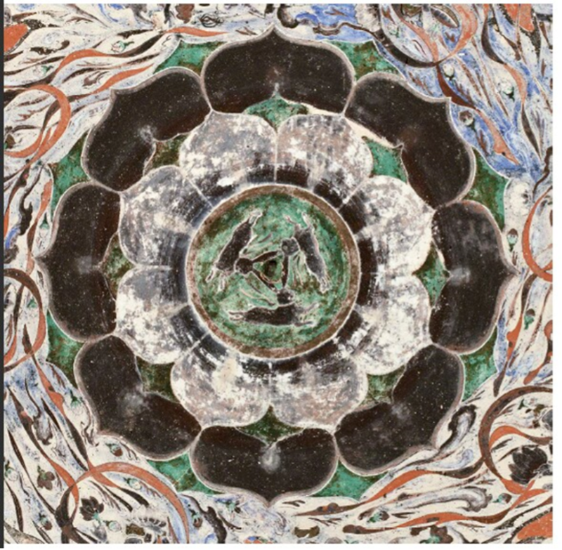 踏入窟內(nèi),仰頭凝望,藻井中央那朵八瓣蓮花宛如夜空中綻放的星辰,花瓣層層疊疊,細膩而生動。蓮花中央,是獨具匠心的三兔連耳圖案。