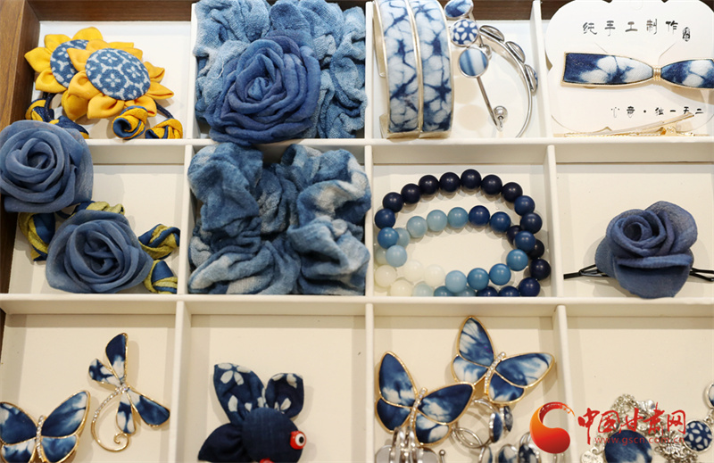 染好的布匹還要經(jīng)過脫漿、清洗、陰干,最后才是拆線、整理。當(dāng)一塊完整的藍印花布展現(xiàn)在眼前時,李梅總會輕輕撫摸布料,仿佛在與草木對話。她的工作室里,掛滿了用藍染制成的物件:桌布上印著成片的板藍根葉,茶席邊緣綴著小巧的藍染布扣,就連她日常穿的棉麻衫,也是自己染的淡藍色。“這些布不是冰冷的商品,是帶著土地溫度的生活。”李梅說,去年她在平?jīng)龉懦情_了一間“藍染生活館”,游客可以跟著她學(xué)種板藍根、體驗扎染,很多人第一次發(fā)現(xiàn),原來衣服上的藍色可以來自田野,非遺技藝能如此貼近日常。