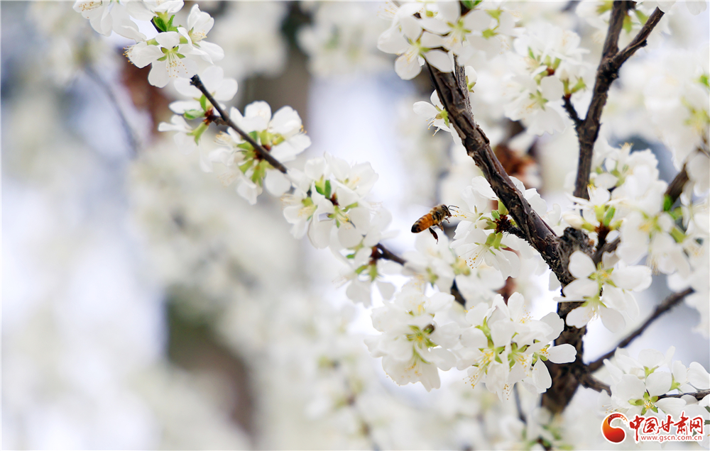 一只蜜蜂停駐花間,振翅采蜜,在純白的花海中增添了靈動生機。各類春花次第開放,白的素雅、粉的嬌嫩、紅的熱烈,為市民獻上一場春日視覺盛宴。