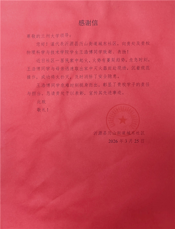近日,一封社區(qū)致蘭州大學(xué)的感謝信,讓該校物理科學(xué)與技術(shù)學(xué)院學(xué)生王浩博的暖心事跡走進(jìn)公眾視野。2026年3月3日,元宵夜,放假居家的他偶遇居民樓突發(fā)火情,憑借校園培訓(xùn)習(xí)得的消防技能,沉著處置初起火災(zāi)、轉(zhuǎn)移危險物品,以本能之舉守護(hù)鄰里安全,彰顯新時代青年的責(zé)任與擔(dān)當(dāng)。