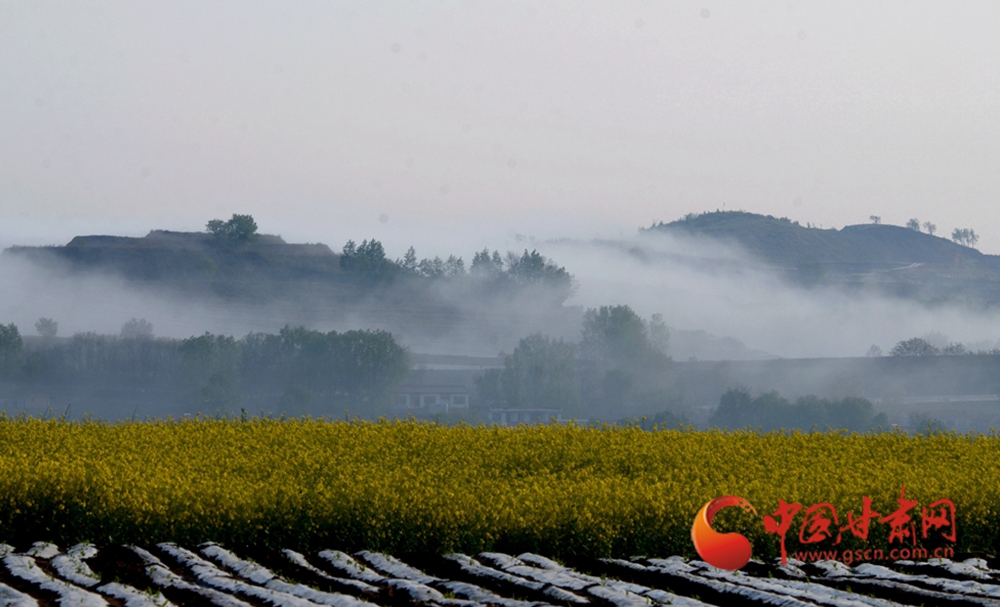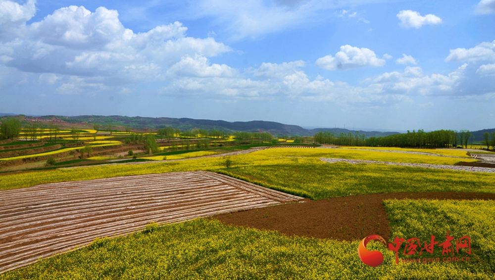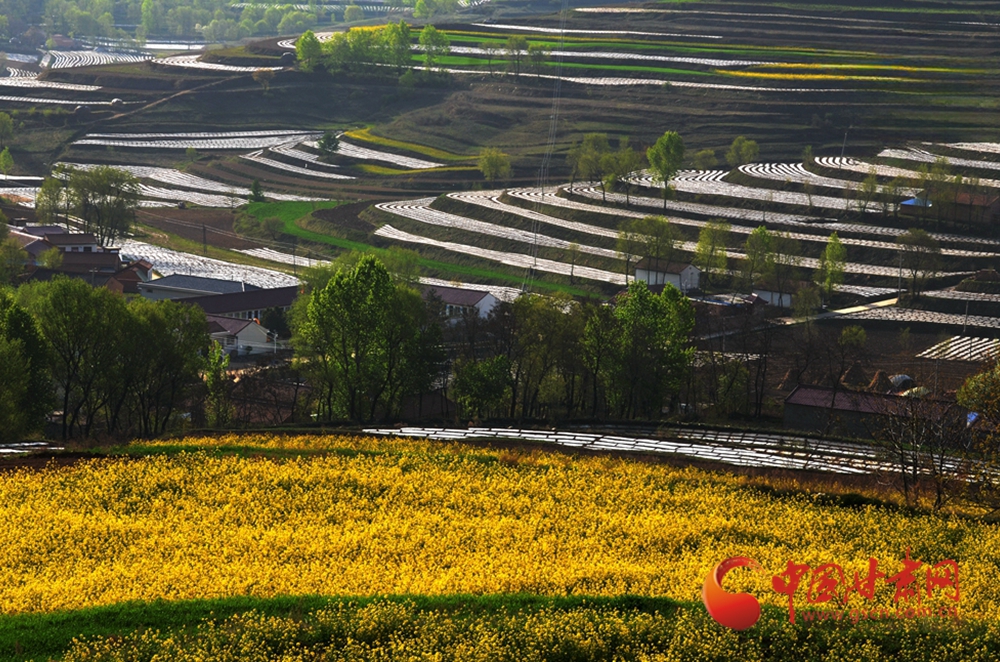 金黃的油菜花田與層層梯田相映成趣,錯(cuò)落的村落掩映在綠樹(shù)間,這是黃土坡上的春日盛景
