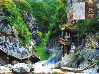 由于路況寬闊平整,從成縣縣城驅(qū)車西行二十分鐘至東入口,便來(lái)到了號(hào)稱青山綠水間的書(shū)法博物館的魚(yú)竅峽,這里就是著名的西狹頌風(fēng)景區(qū)。“光怪靈潭氣欲春,波平浪靜一輪存。鏡連五色龍成彩,珠映千鱗月映痕。”果然,這方寶地清幽綺麗,青山對(duì)峙,澗流清澈。峽內(nèi)的山、水、石、樹(shù),皆成風(fēng)景;亭、橋、廊、榭,相映成趣。舉目環(huán)望,山崖上綠樹(shù)層疊,其間亦或有古樹(shù)參天,老藤纏繞。兩山之間的響水河,或在峽谷中潺潺繞行,或在巨石間沖騰奔瀉,浪花激起的水聲。更美的是懸崖上的水,化成一條白練從高處垂落而下,直泄黃龍?zhí)?。西峽飛瀑“龍?zhí)队吃?rdquo;便成為成縣著名的八景之一,至今為世人津津樂(lè)道,贊嘆不已。