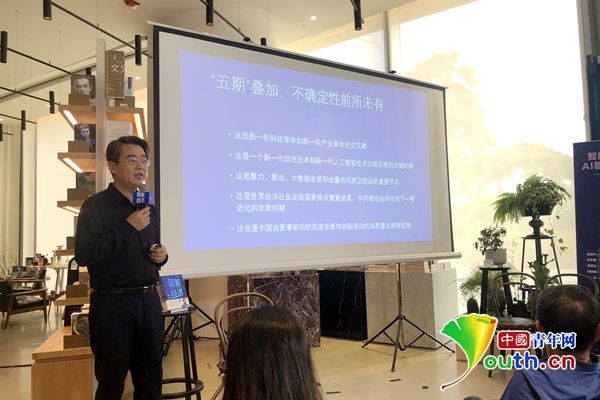 《智能經(jīng)濟(jì)》新書(shū)研討會(huì)上,張曉峰在進(jìn)行主題演講。中國(guó)青年網(wǎng)記者 張?jiān)姮?nbsp;攝