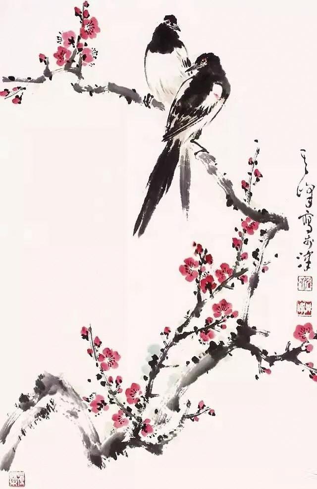 那是我第一次看見梅花,墨黑的枝干上,稀稀疏疏臥著幾朵紅紅的梅花,很安靜。畫上有四個字:傲雪紅梅。兩邊還有對聯(lián),內(nèi)容已經(jīng)不記得了。正值外面大雪紛飛,院子里已落了一層白白的積雪,一時間詩意悠然。對著那副梅花圖,清清爽爽的,令人內(nèi)心好快樂。那時,我在讀《紅樓夢》,只記住了那句:琉璃世界白雪紅梅。