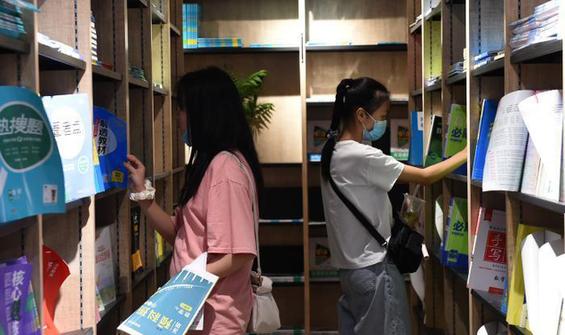 資料圖:圖為學(xué)生在書店里挑選練習(xí)題。 周毅 攝