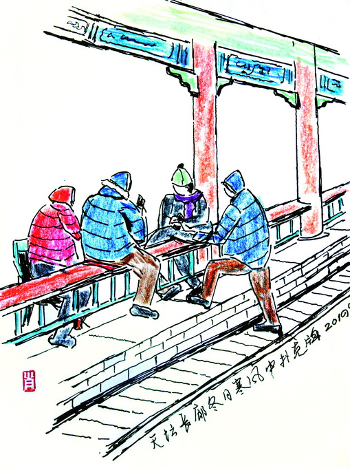 童年時(shí),我家離天壇很近,即便是現(xiàn)在的住所,離天壇也不算遠(yuǎn),地利之便,使我和天壇有種天生的緣分。這種緣分不是一見鐘情,而像長(zhǎng)時(shí)間接觸磨出來(lái)的老繭,結(jié)實(shí)且持久。幾十年來(lái),天壇是我最常去的公園,最近幾年迷上畫畫,更要去那里畫速寫。由于畫畫,身邊總會(huì)站著幾個(gè)看畫的人,無(wú)論褒貶,一定得聊上幾句。以前有人看我畫畫,我老覺得不自在,后來(lái)臉皮不僅變厚了,心里還冒出個(gè)念頭:如果天天到這里畫畫,可以接觸到好多人,隨手記下各色人等的人生百態(tài),這不是挺有意思的嗎?