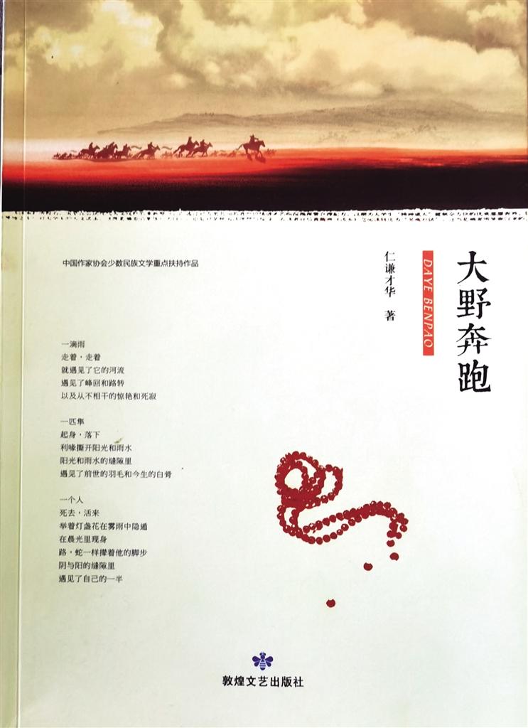 詩歌集《大野奔跑》是仁謙才華近年來的傾心之作,該作品由敦煌文藝出版社出版發(fā)行。詩集由作家張存學(xué)作序,收錄了仁謙才華4年來發(fā)表在《詩刊》等刊物上130余首詩歌。張存學(xué)在序中這樣評價:“語言,既是阻礙,也是抵達之路,這個緊張度也是考驗一個寫作者的坎,這個坎過得好一些就能夠把握住詩抵達生命的本真,把握不好,就會在空泛的意象中游走。仁謙才華在這方面的蛻變,從他這本詩集能夠看出,他由早期的直抒胸意、向外張揚變得安靜起來,變得從容而多思,也變得獨立而內(nèi)在……”