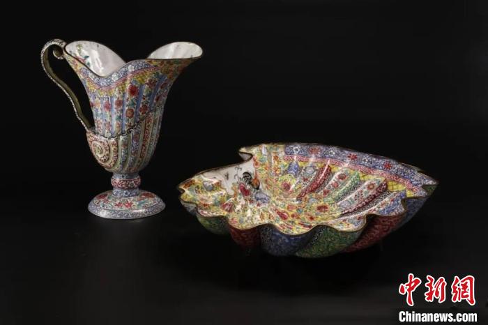 館藏的銅胎畫琺瑯花卉紋洗盤及水澆。廣東省博物館 供圖