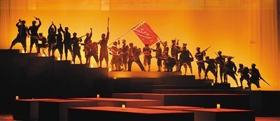 類(lèi)似這樣耐人尋味、畫(huà)龍點(diǎn)睛的改編還有許多,比如原著中的“小彭”變成了“小火柴”,代表了點(diǎn)燃的微火和一種希望;“答答滴滴滴,滴滴滴答答”不僅是符號(hào)化的電碼,而且成為了最好的祝福,一句臺(tái)詞蘊(yùn)含多層含義,滿含深情。從“最后的電波”到“鐵流東進(jìn)”,更展現(xiàn)了一種大歷史觀、大時(shí)代觀,真正符合立體的舞臺(tái)呈現(xiàn)。