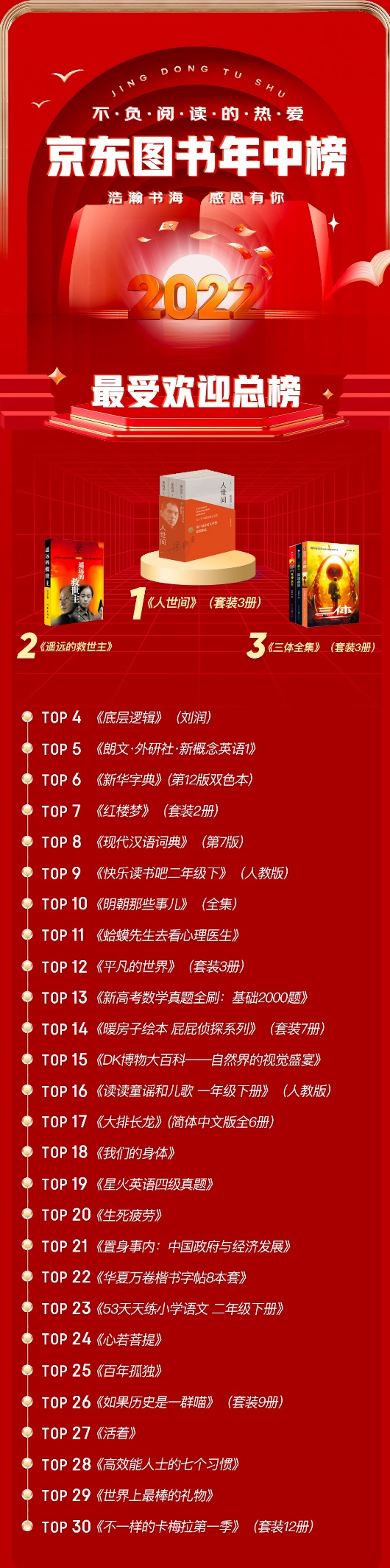 近日,京東圖書發(fā)布了2022年中圖書暢銷榜,包括總榜、新書榜,以及文學(xué)、經(jīng)管、童書、社科、科技、勵志、生活、藝術(shù)、文教、考試等10個類別的分榜,每個榜單均有30種圖書入榜,入榜圖書總數(shù)超過300種。