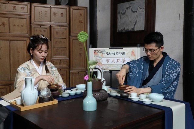 “詩畫江南 行閱典籍”曬書活動(dòng)之“宋式點(diǎn)茶”。費(fèi)騰輝攝