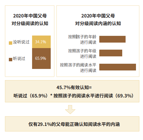 雖然分級(jí)閱讀已經(jīng)成為國(guó)際公認(rèn)的閱讀趨勢(shì),可是,從當(dāng)當(dāng)聯(lián)合艾瑞發(fā)布的《2020年中國(guó)K12階段學(xué)生“分級(jí)閱讀”白皮書》(以下簡(jiǎn)稱《白皮書》)中,我們發(fā)現(xiàn)中國(guó)大部分父母對(duì)于分級(jí)閱讀尚缺乏認(rèn)識(shí),更談不上有足夠的重視?!栋灼分赋觯?5.9%的父母聽說過“分級(jí)閱讀”,而其中真正了解“分級(jí)閱讀”的父母只占45.7%。