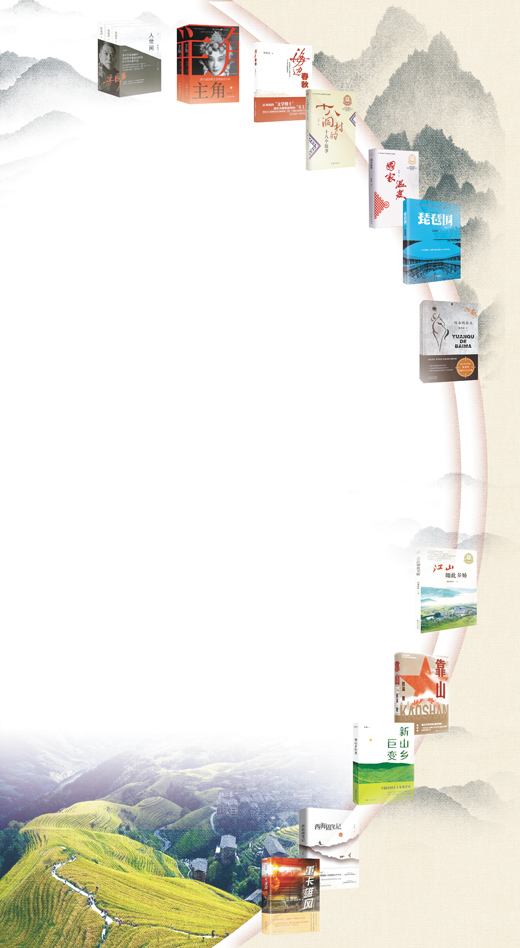 書(shū)影圖片從上至下依次為《人世間》《主角》《海邊春秋》《十八洞村的十八個(gè)故事》《國(guó)家溫度》《琵琶圍》《遠(yuǎn)去的白馬》《江山如此多嬌》《靠山》《新山鄉(xiāng)巨變》《西海固筆記》《重卡雄風(fēng)》(按出版時(shí)間排序)。何向陽(yáng) 供圖;底圖為廣西龍勝各族自治縣龍脊梯田景色。韋吉陽(yáng) 攝(人民視覺(jué))