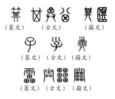?。ㄎ澹┧^“9353”,指的是《說(shuō)文》所收全部正篆,即《說(shuō)文》分析解釋的全部字。《說(shuō)文》收字以篆文為“正”,作為標(biāo)準(zhǔn)字體,這就是許慎所說(shuō)的“今敘篆文,合以古籀”的收字原則。“今敘篆文”,就是以篆文(小篆)作為標(biāo)準(zhǔn)正字,同時(shí)也會(huì)根據(jù)需要收列部分古文和籀文?!墩f(shuō)文》所謂“古文”主要是孔子壁中書和民間所獻(xiàn)古文經(jīng)所用的文字,“籀文”即傳為西周晚期太史籀所編字書《史籀篇》上的文字。從《說(shuō)文》來(lái)看,收入的古文、籀文,主要是與篆文有明顯差異的字形。如篆文“箕”“子”“雷”下所收列的古文、籀文: