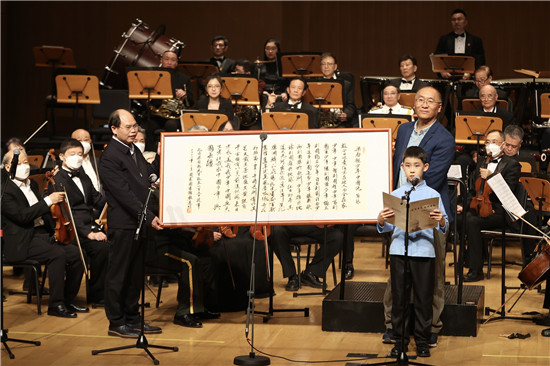 2月23日,北京,“前哲垂范 文津日新”——梁?jiǎn)⒊Q辰150周年紀(jì)念配樂朗誦音樂沙龍?jiān)趪覉D書館舉行。中國國家圖書館館長(zhǎng)熊遠(yuǎn)明(左)向梁?jiǎn)⒊笕速?zèng)手書《少年中國說》。 蔣啟明/攝