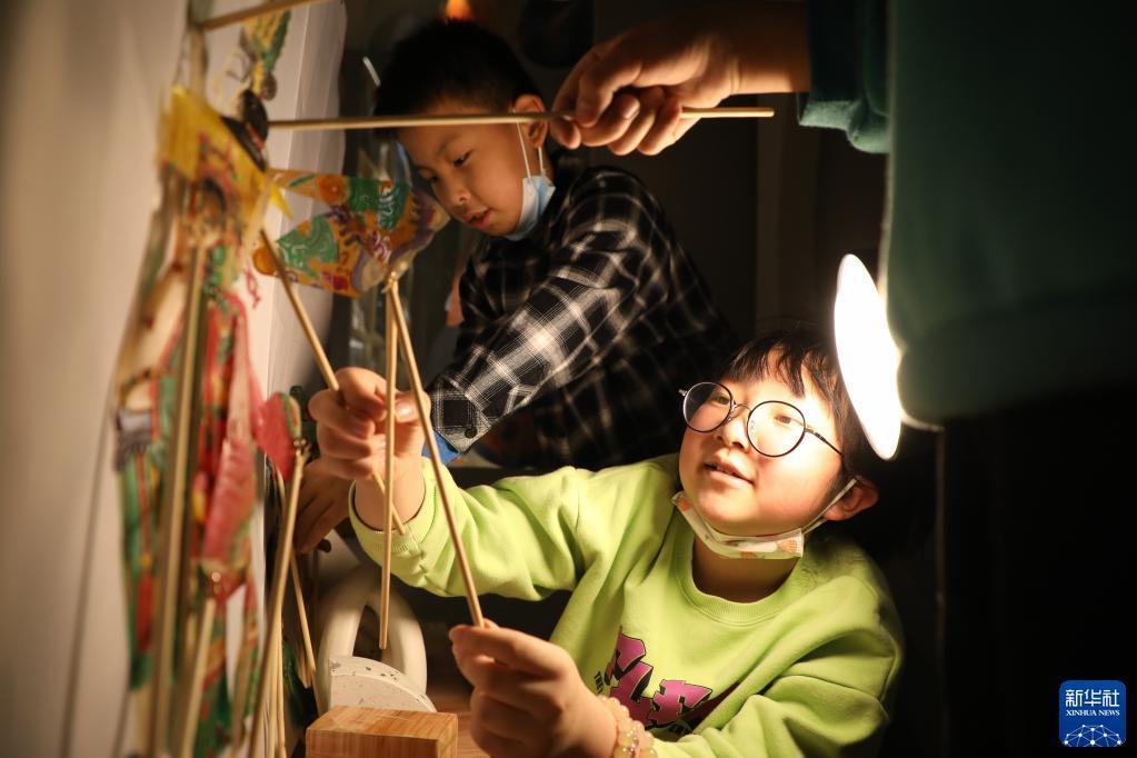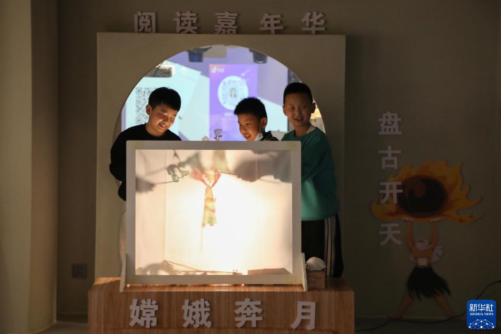 4月1日,在甘肅省蘭州市的讀者出版集團數字閱讀中心讀者小站,小朋友體驗中國神話故事主題皮影戲。新華社記者 馬希平 攝