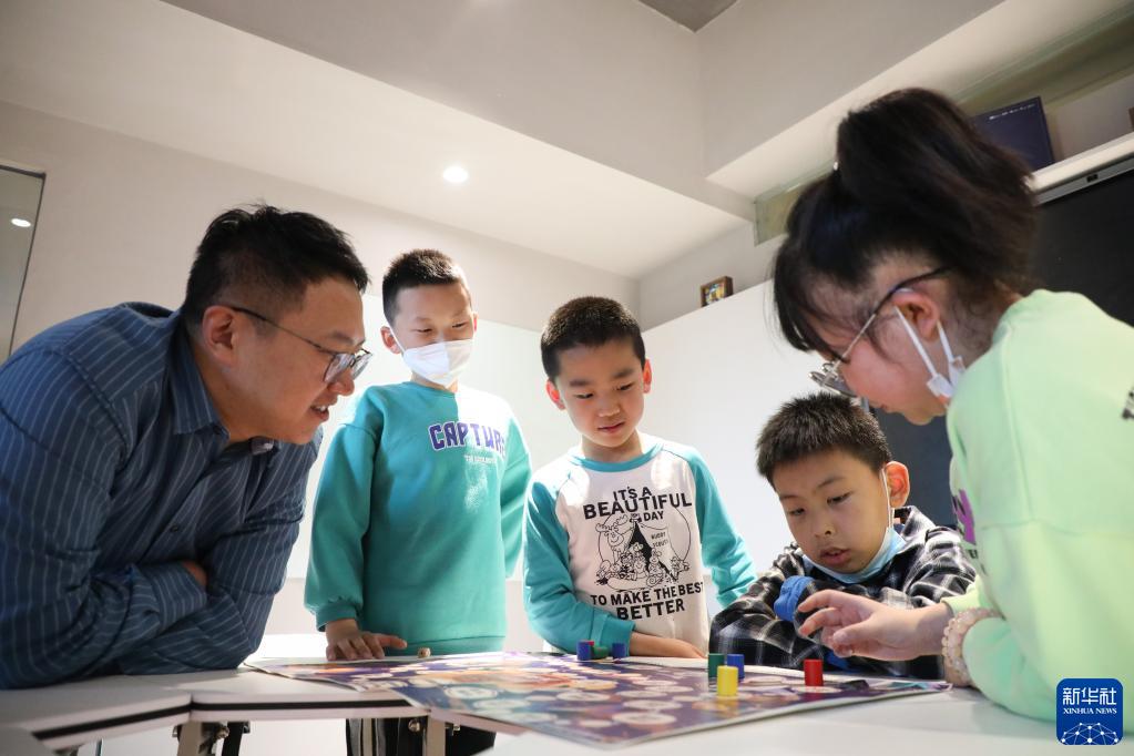 4月1日,在甘肅省蘭州市的讀者出版集團數字閱讀中心讀者小站,工作人員與小朋友一起玩“講述中國神話故事”的飛行棋游戲。新華社記者 馬希平 攝