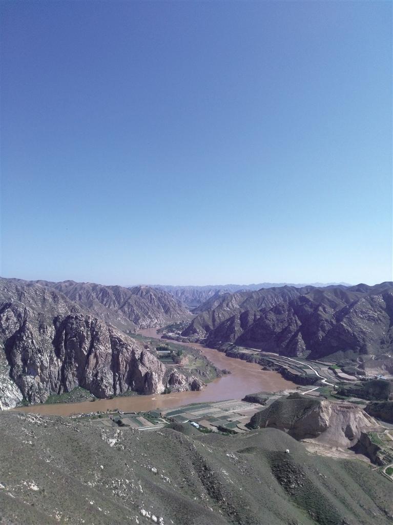 向西鳥瞰黃河,黃河幾乎直線撲面而來,河水發(fā)黃,流淌緩慢。過去這里,河水湍急,老遠就能聽到咆哮之聲。由于20世紀末,在下游20公里處建了小峽水庫,河水被抬升,河水流緩。黃河北面,依然是光禿禿的山巒。低頭看腳下的黃河,南岸的漢長城遺址清晰可見,旁邊有二三個人在農(nóng)田勞作。黃河流到此處,被腳下的九圪垯山迎面阻擋,折而向北,切開重重山巒,帶著野性,蜿蜒而去,一點兒也不留戀桑園子峽,不留戀九圪垯山,不留戀滄桑的大地和歲月。