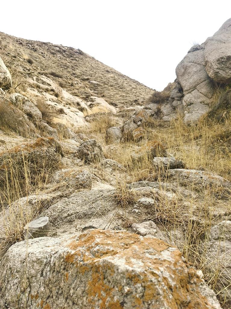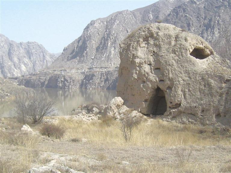 東坪向東300米,就是榆中境內(nèi)唯一遺留的一處漢長城遺址,該遺址現(xiàn)只有一處墻墩,緊鄰黃河,圍長40 余米,高約5米,無任何防護措施,墻壁上,有磚、石混雜其中,人工夯筑之痕清晰可辨。西側(cè)墻面上,還有人掏挖的小窯洞。高1.3米,深達50厘米。破壞嚴重。漢長城遺址再向東200米,東金公路向右拐入七峴溝,向來紫堡川而去,而黃河則被東面的大山阻擋,無路可去,左拐北折而流向什川。此處就是著名的黃河大“幾”字灣的第一灣。第一灣的南岸,有十來戶人家,地名叫駱圈灣。由于地處古絲綢之路,曾建有駱駝圈和小型客棧供駱駝客隊歇腳而又在黃河拐彎處而得名,后來,因諧音,叫羅泉灣。山腳下,有七八棵楊柳已吐綠。沿黃河,已無路可尋,就沿洪水沖的山溝上東山,還是無路,甚至沒有羊腸小道,巖石裸露,怪石嶙峋,坡陡難行。巖石層只有七八十米厚。此山的石頭,含有石英成分,石質(zhì)軟,無開采利用價值。再往上,就是黃土層,直到山頂。由于干旱,整個山上,無一棵樹木,甚至連灌木都沒有。耐堿耐旱的駱駝蓬只發(fā)出二厘米的枝蔓,一些蒿草和矮草,也剛發(fā)芽,還有一些匍匐在地面的無名小草,卻已開出了扁豆大小的艷麗的小花,有白色的和淡藍色的蝴蝶飛起飛落。爬到半山腰,太陽已全面照曬,山坡雖陡峭,卻無陰涼可乘。渾身發(fā)熱,不得不解開衣扣,緩慢前行。