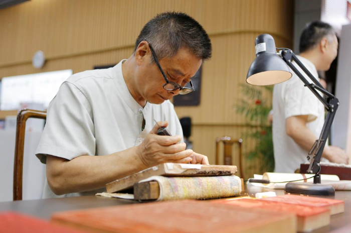 8月22日,在揚州市圖書館,江蘇省雕版工藝美術大師沈樹華在“古籍里的揚州運河文化”市集上為市民展示雕刻技藝。