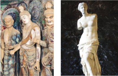 可是,“脅侍菩薩微笑著,在她低垂的眼中可能根本沒(méi)有勝負(fù)這回事。這種眼神是利他而非個(gè)人的……當(dāng)我們?cè)?5窟佛龕前微微俯下身子之時(shí),溫暖的奇跡出現(xiàn)了,她正慈祥地看著你。一位是由堅(jiān)硬的大理石所雕,另一位是由敦煌本地黏土所塑,維納斯和脅侍菩薩似乎代表了兩種生活態(tài)度。假如她們?cè)诒R浮宮中相遇,談?wù)撈鹈?。維納斯可能會(huì)唱起女詩(shī)人薩福的詩(shī)歌:‘你愛的就是美的。這容易解釋。’脅侍菩薩則依然保持微笑,靜靜地看著維納斯”。