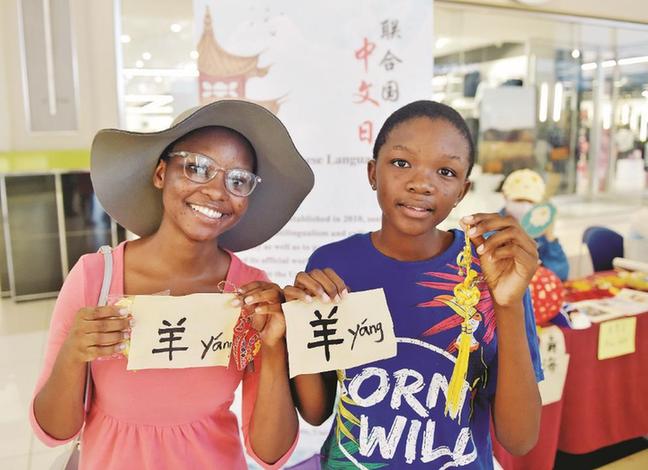 20日,孩子們在博茨瓦納哈博羅內(nèi)舉行的中文日慶祝活動(dòng)上展示漢字。 新華社發(fā)