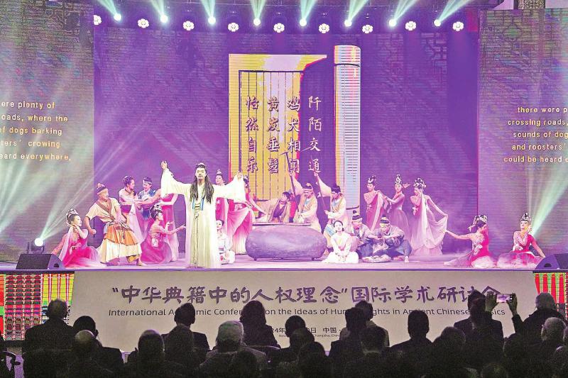 11月20日,由中國人權研究會、湖南省委宣傳部、湖南大學主辦的“中華典籍中的人權理念”國際學術研討會在湖南大學岳麓書院開幕。來自中國、美國、加拿大、意大利、印度、巴基斯坦、日本等國家的200余名專家學者與聯(lián)合國國際機構代表,以及國內有關部門、社會組織代表參會研討。圖為演員在“中華典籍中的人權理念”國際學術研討會開幕式暨主論壇現(xiàn)場表演。
