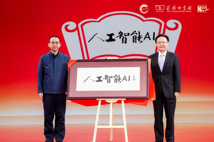 商務(wù)印書館副總經(jīng)理陳晗雨(左),中宣部“學習強國”學習平臺編委、副總經(jīng)理杜大力(右)揭曉年度國際詞“人工智能(AI)”。新華網(wǎng) 發(fā)
