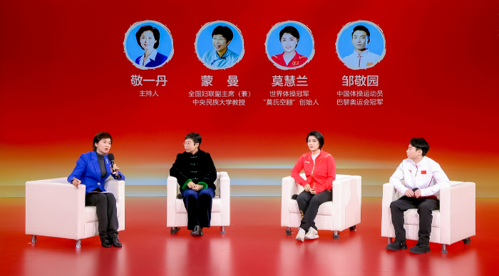 全國婦聯(lián)副主席(兼)、中央民族大學教授蒙曼,世界體操冠軍、“莫氏空翻”創(chuàng)始人莫慧蘭,中國體操運動員、巴黎奧運會冠軍鄒敬園接受訪談。新華網(wǎng) 發(fā)