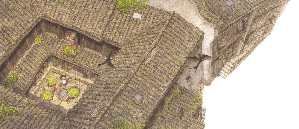 整個繪本主要采用寫實性的現(xiàn)實主義風格,繪畫者付出極大的耐心和精力,用鋼筆和馬克筆細致描繪每一片磚瓦、每一塊石板、每一叢花葉、每一扇門窗,甚至每一條木紋、每一絲波紋、每一道皺紋……力求真實地呈現(xiàn)物像的肌理和質(zhì)感,讓人身臨其境。同時,也加以寫意的手法,用柔和的淡彩渲染懷舊的色調(diào)和溫馨的氛圍。尤其值得稱道的是,在多幅畫面中,以丫丫等待的“神秘的客人”——燕子為一種符號角色,無論之于畫面還是主旨,都有其獨到的意義。燕子飛翔于水面和屋宇之上,給靜態(tài)的環(huán)境帶來靈動之感,有時還能平衡畫面的結(jié)構(gòu)。燕子是江南春天的使者,也是童年喜愛的精靈。蘇軾和歐陽修各自的《蝶戀花》詞中都寫到了燕子,前者是:“花褪殘紅青杏小。燕子飛時,綠水人家繞。”后者是:“畫閣歸來春又晚。燕子雙飛,柳軟桃花淺。”這一古典意象在繪本畫面中的反復(fù)出現(xiàn),羽翼間展開了江南的典雅、清麗以及輕愁。作品里的另一種動物是時??M繞主人腳邊的貓咪,增添了祥和的家居趣味,也代表一種熟稔的情感皈依。原本黑瓦白墻的江南民居在畫面中作為背景或前景,灰中帶彩、冷中帶暖,既體現(xiàn)了時間的流逝,也象征著永恒的家園。外公背著丫丫雨夜歸家的場景以多個連貫畫面變換角度來鋪展,暗夜中始終有溫暖的燈光照亮回家的路,也有堅實的后背托舉稚嫩的夢,給孩子以安全、安穩(wěn)和安心。