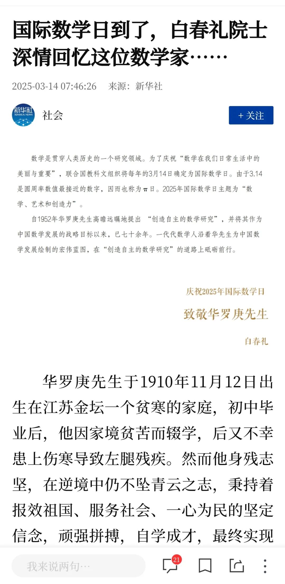 新版問世后,白春禮院士在新華社撰文《國際數(shù)學日到了,白春禮院士深情回憶這位數(shù)學家......》力薦本書,獲超150萬閱讀量。